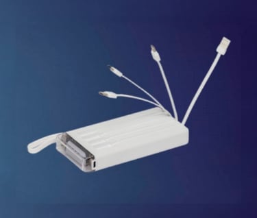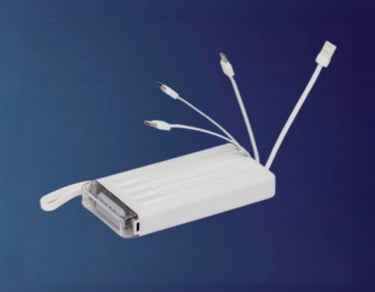 Descrição: Carregador power bank de 10.000 mAh com lanterna e multiplas saídas. Produzido com plástico, este power bank possui indicadores de bateria e vem equipado com quatro cabos de carregamento, eliminando a necessidade de transportar cabos extras. compativel com entradas v8, Tipo-C, lightning e USB, praticidade é sinonimo deste carregador