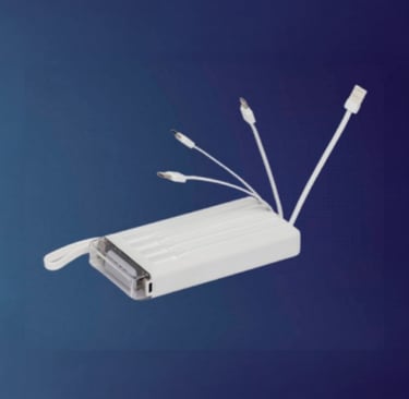 Descrição: Power bank plástico de 5.000 mAh com indicadores LED de bateria e cabos acoplados Lightining e V8. Acompanha USB V8 e adaptador TIPO-C